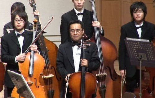 My first and maybe the last concert (1-27-07, at Nova Hall)in my life. Made a couple of mistakes but it went OK. One of my greatest achievements in my life. I am a proud member of University of Tsukuba Orchestra! I am sitting the first row, 2nd seat from the rear end (the last cello from the center, front seat, right in front of the contrabass) |